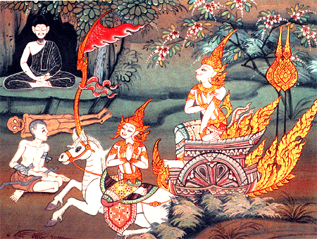 Mural Painting >> Life of Lord Buddha The Four Signs On the four royal park tours the Prince saw an old man, a sick man, a dead man and a ascetic respectively which made Him weary of the conditioned things.