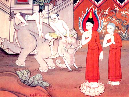 Mural Painting >> Life of Lord Buddha The Buddha subdues a raging elephant Bribed by Devadatta, the rebel disciple of the Buddha, the mahout let the elephant charge to kill the Master. But through the Lord's loving kindness the elephant knelt down in front of the Buddha.