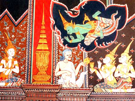 Mural Painting >> Life of Lord Buddha Distribution of the Buddha's Relics Dona, the Brahmin, was entrusted to distribute the Buddha's relics and ashes to various kingdoms which sent their messengers to ask for some portions.