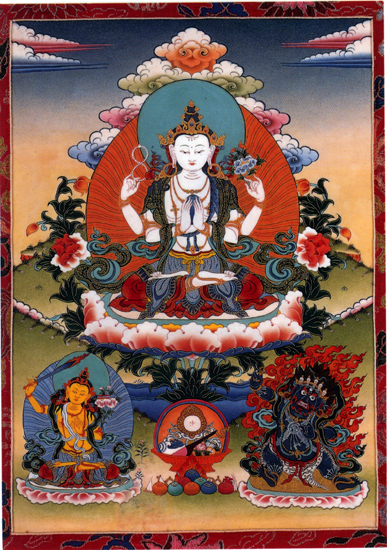 Buddhist Images >> Tibetan Buddhist Images >> Thangkas 4 Arms Avalokiteshvara A Thangka is a complicated, composite three-dimensional object consisting of: a picture panel which is painted or embroidered, a textile mounting; and one or more of the following: a silk cover, leather corners, wooden dowels at the top and bottom and metal or wooden decorative knobs on the bottom dowel. What is the purpose of a Thangka, what use was it originally intended for? Thangkas are intended to serve as a record of, and guide for contemplative experience. In this way, Thangkas are intended to convey iconographic information in a pictorial manner. A text of the same meditation would supply similar details in written descriptive form.