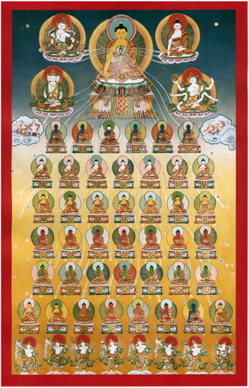Buddhist Images >> Tibetan Buddhist Images >> Thangkas 35 Buddhas Thangka 1 A Thangka is a complicated, composite three-dimensional object consisting of: a picture panel which is painted or embroidered, a textile mounting; and one or more of the following: a silk cover, leather corners, wooden dowels at the top and bottom and metal or wooden decorative knobs on the bottom dowel. What is the purpose of a Thangka, what use was it originally intended for? Thangkas are intended to serve as a record of, and guide for contemplative experience. In this way, Thangkas are intended to convey iconographic information in a pictorial manner. A text of the same meditation would supply similar details in written descriptive form.