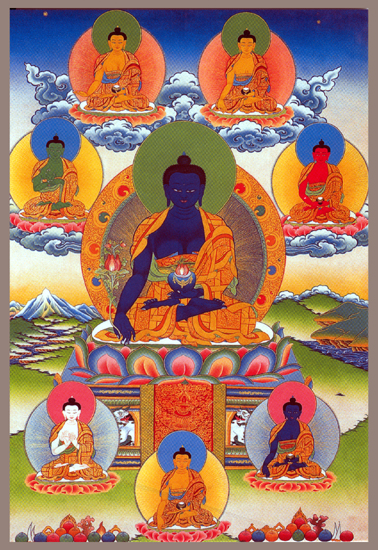 Buddhist Images >> Tibetan Buddhist Images >> Thangkas Medicine Buddha Thangka A Thangka is a complicated, composite three-dimensional object consisting of: a picture panel which is painted or embroidered, a textile mounting; and one or more of the following: a silk cover, leather corners, wooden dowels at the top and bottom and metal or wooden decorative knobs on the bottom dowel. What is the purpose of a Thangka, what use was it originally intended for? Thangkas are intended to serve as a record of, and guide for contemplative experience. In this way, Thangkas are intended to convey iconographic information in a pictorial manner. A text of the same meditation would supply similar details in written descriptive form.