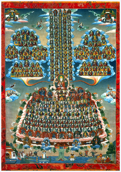 Buddhist Images >> Tibetan Buddhist Images >> Thangkas Merit Field Thangka A Thangka is a complicated, composite three-dimensional object consisting of: a picture panel which is painted or embroidered, a textile mounting; and one or more of the following: a silk cover, leather corners, wooden dowels at the top and bottom and metal or wooden decorative knobs on the bottom dowel. What is the purpose of a Thangka, what use was it originally intended for? Thangkas are intended to serve as a record of, and guide for contemplative experience. In this way, Thangkas are intended to convey iconographic information in a pictorial manner. A text of the same meditation would supply similar details in written descriptive form.