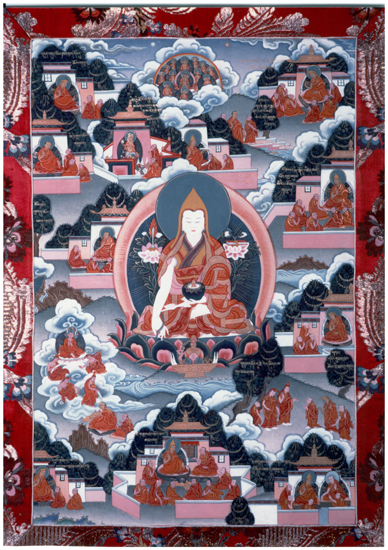 Buddhist Images >> Tibetan Buddhist Images >> Thangkas Lama Tsongkapa 02 A Thangka is a complicated, composite three-dimensional object consisting of: a picture panel which is painted or embroidered, a textile mounting; and one or more of the following: a silk cover, leather corners, wooden dowels at the top and bottom and metal or wooden decorative knobs on the bottom dowel. What is the purpose of a Thangka, what use was it originally intended for? Thangkas are intended to serve as a record of, and guide for contemplative experience. In this way, Thangkas are intended to convey iconographic information in a pictorial manner. A text of the same meditation would supply similar details in written descriptive form.