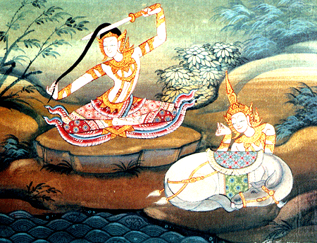 Mural Painting >> Life of Lord Buddha The Prince in an act of renuciation, cuts His hair On reaching the bank of Anoma River the Prince cut off hair with the sword.